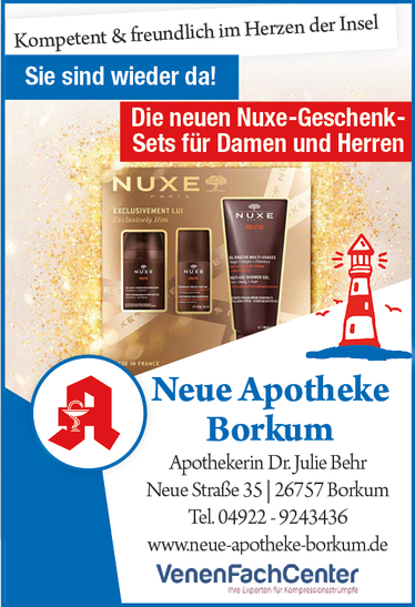 Neue Straße 35, 26757 Borkum, Telefon: 04922 9243436, Fax: 04922 9243437, Email: mail(at)neue-apotheke-borkum.de