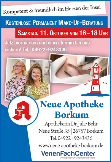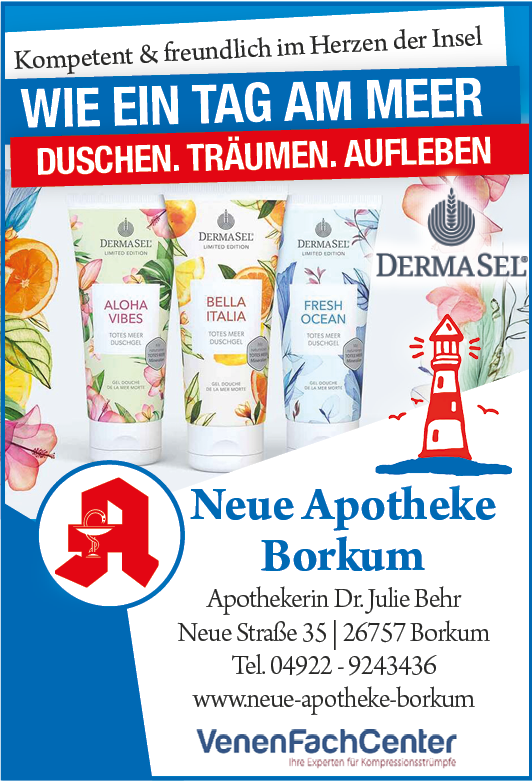 Neue Straße 35, 26757 Borkum, Telefon: 04922 9243436, Fax: 04922 9243437, Email: mail(at)neue-apotheke-borkum.de